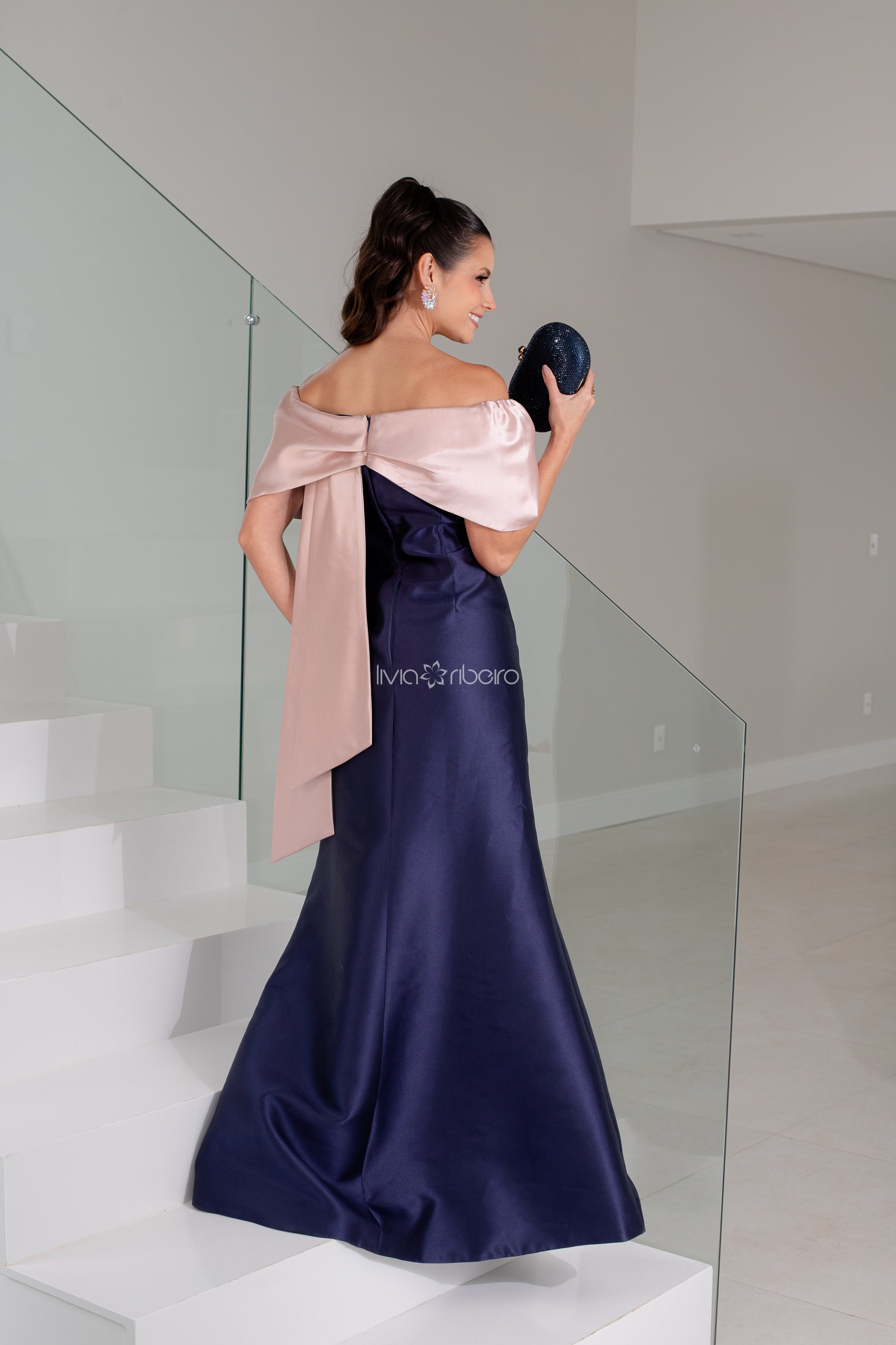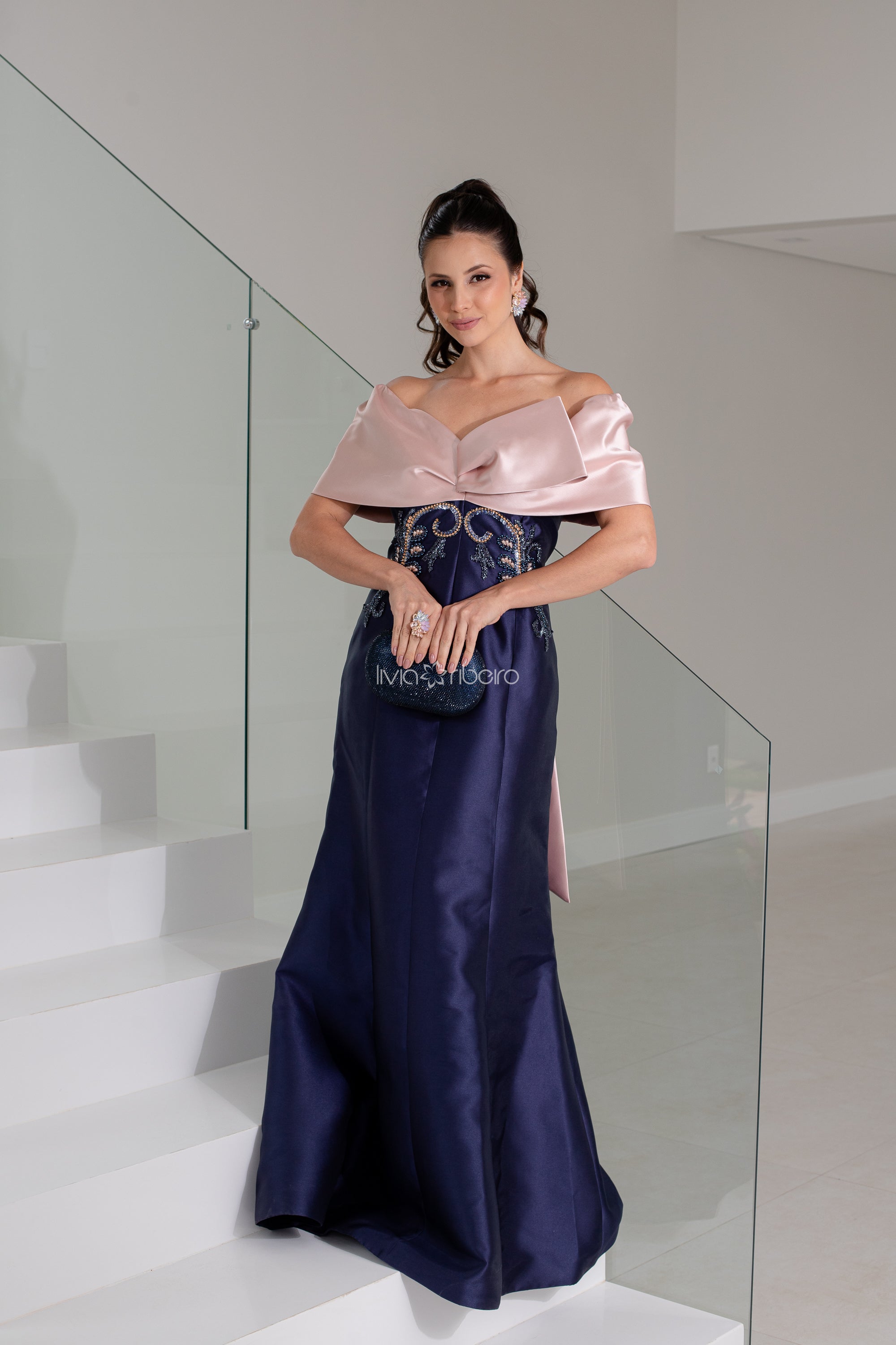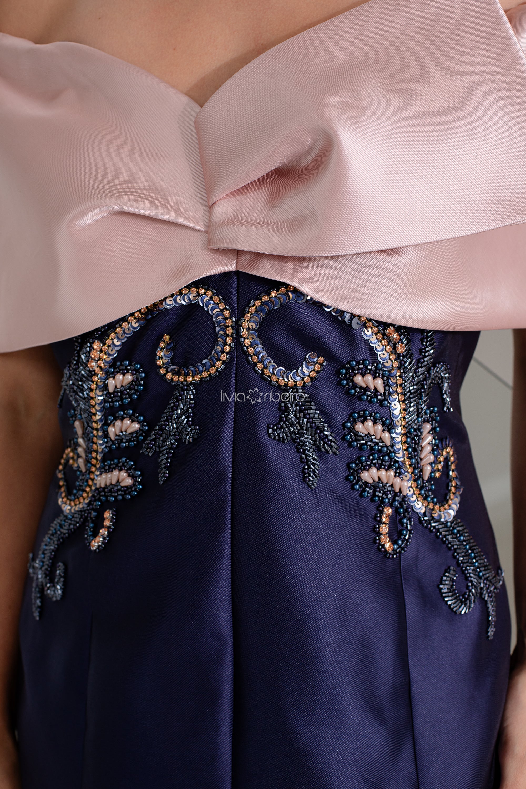 Vestido em alfaiataria, confeccionado no tecido Zibeline, corte sereia, decote ombro a ombro , nas cores azul marinho e rosé. Ele possui leves bordados feito a mão no corpo do vestido.