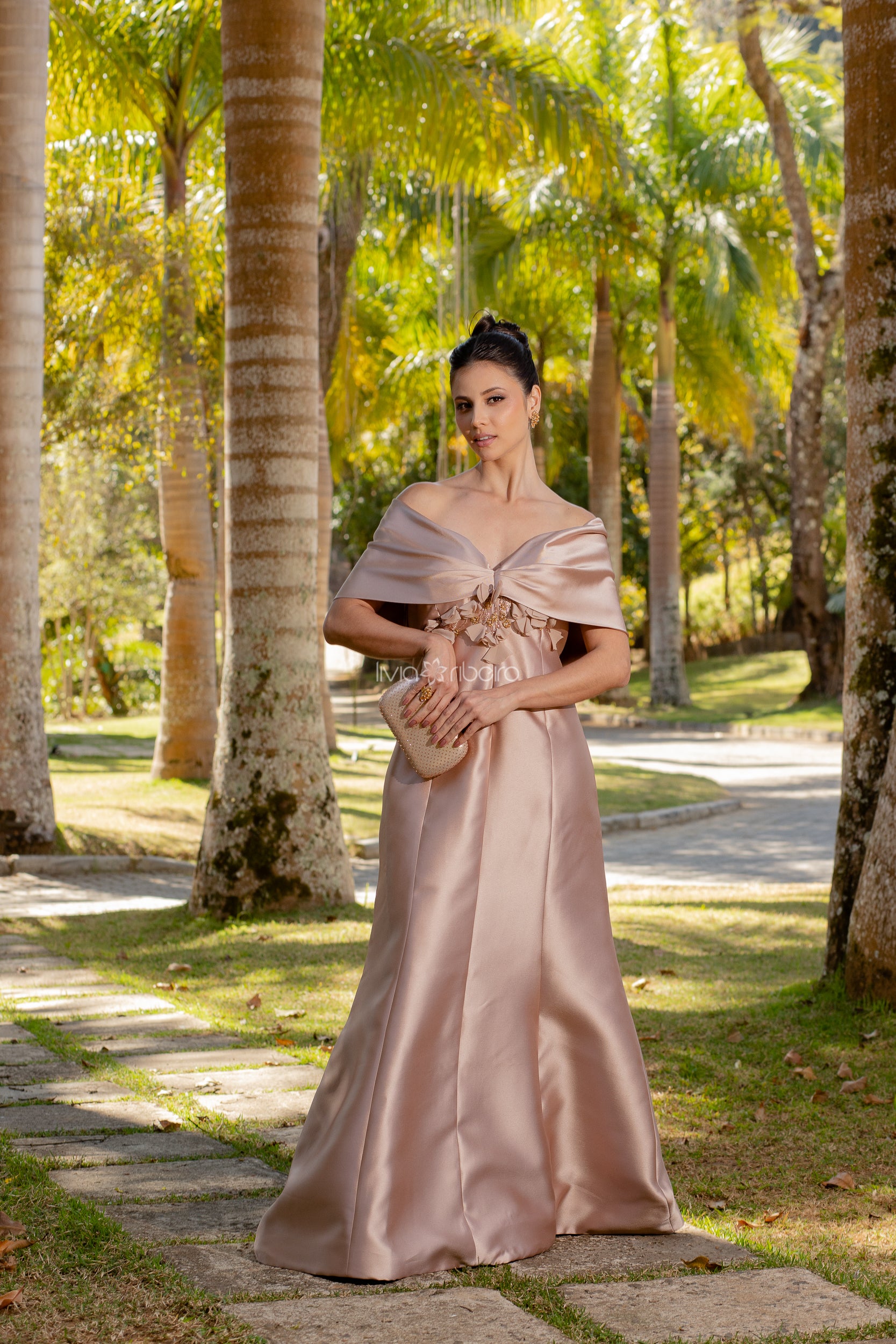 Vestido Lívia Ribeiro em alfaiataria ombro a ombro com capa em crepe de seda