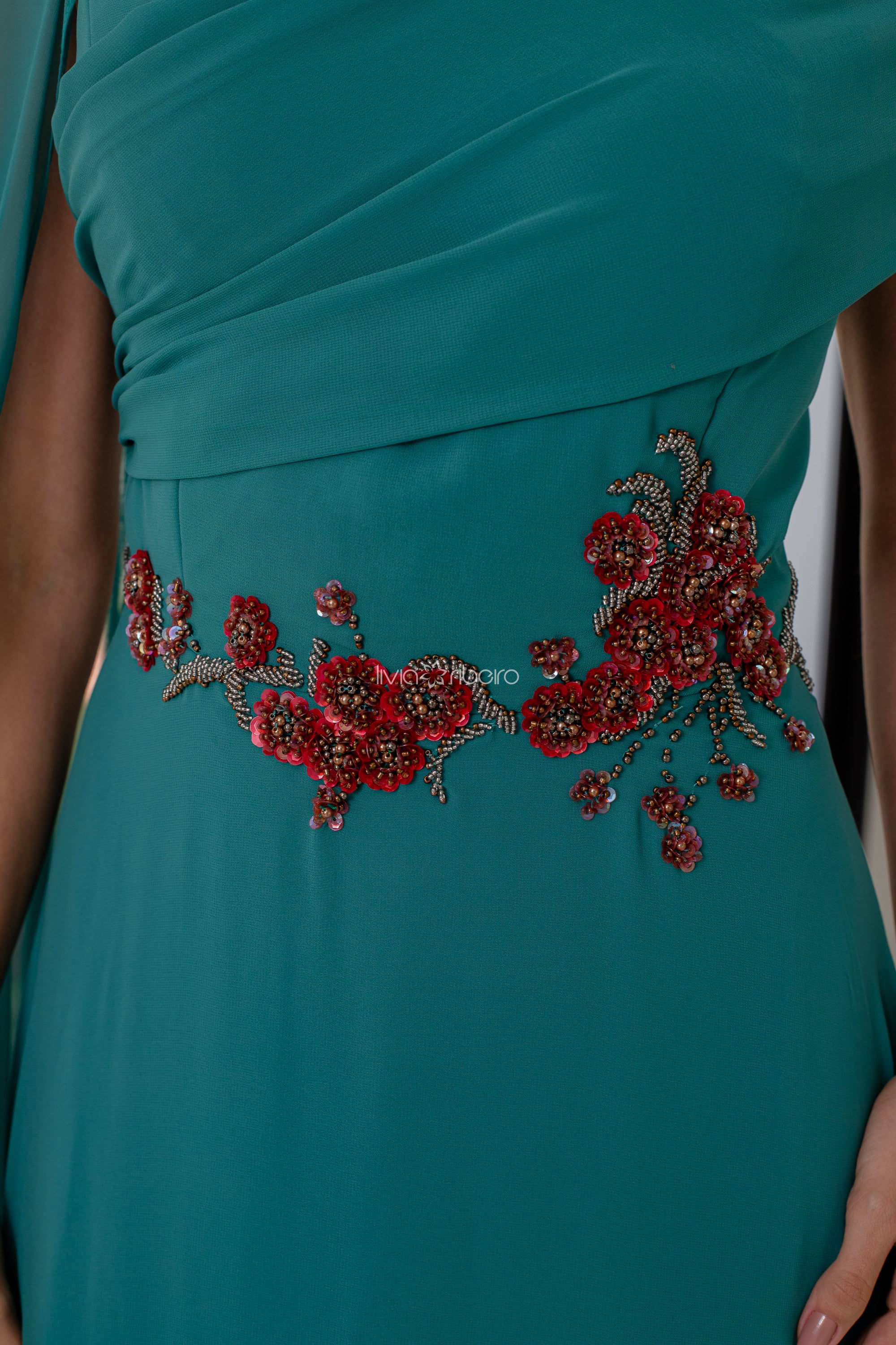 Vestido em crepe com toque de seda, saia corte reto, com bordado colorido na cintura
