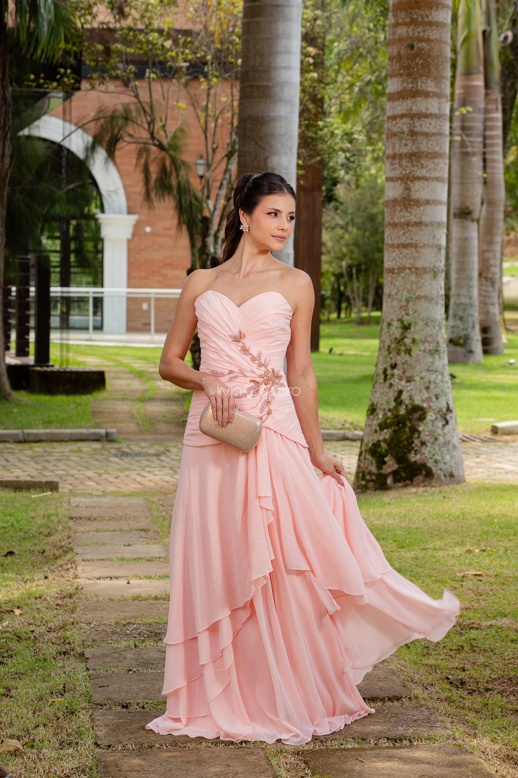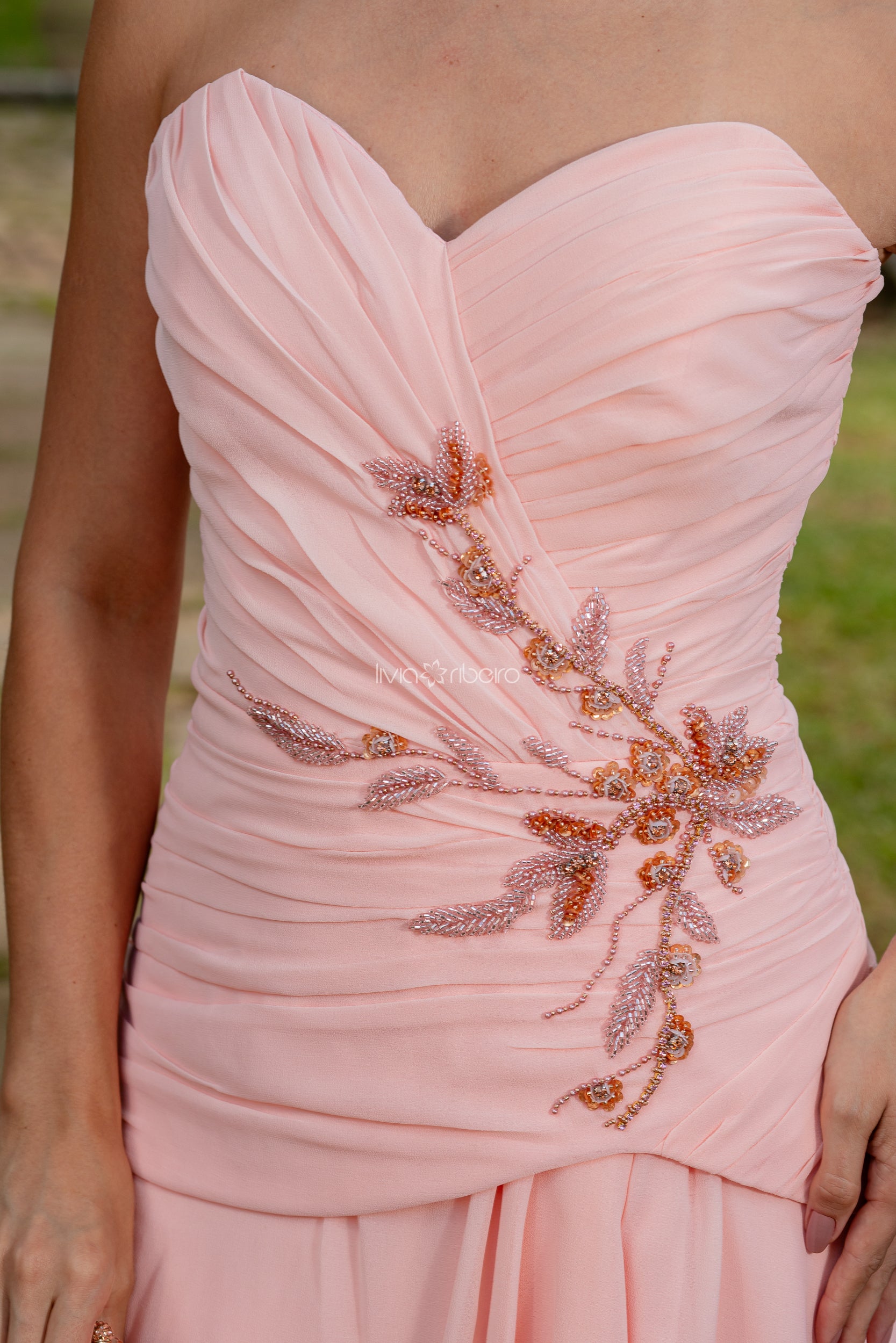 Vestido longo confeccionado em crepe de seda na tonalidade laranja, com decote tomara que caia estruturado e modelagem que valoriza a silhueta. O bordado aplicado na lateral do busto cria um ponto de luz sofisticado, enquanto a saia fluida com sobreposições acrescenta movimento e leveza ao caminhar.