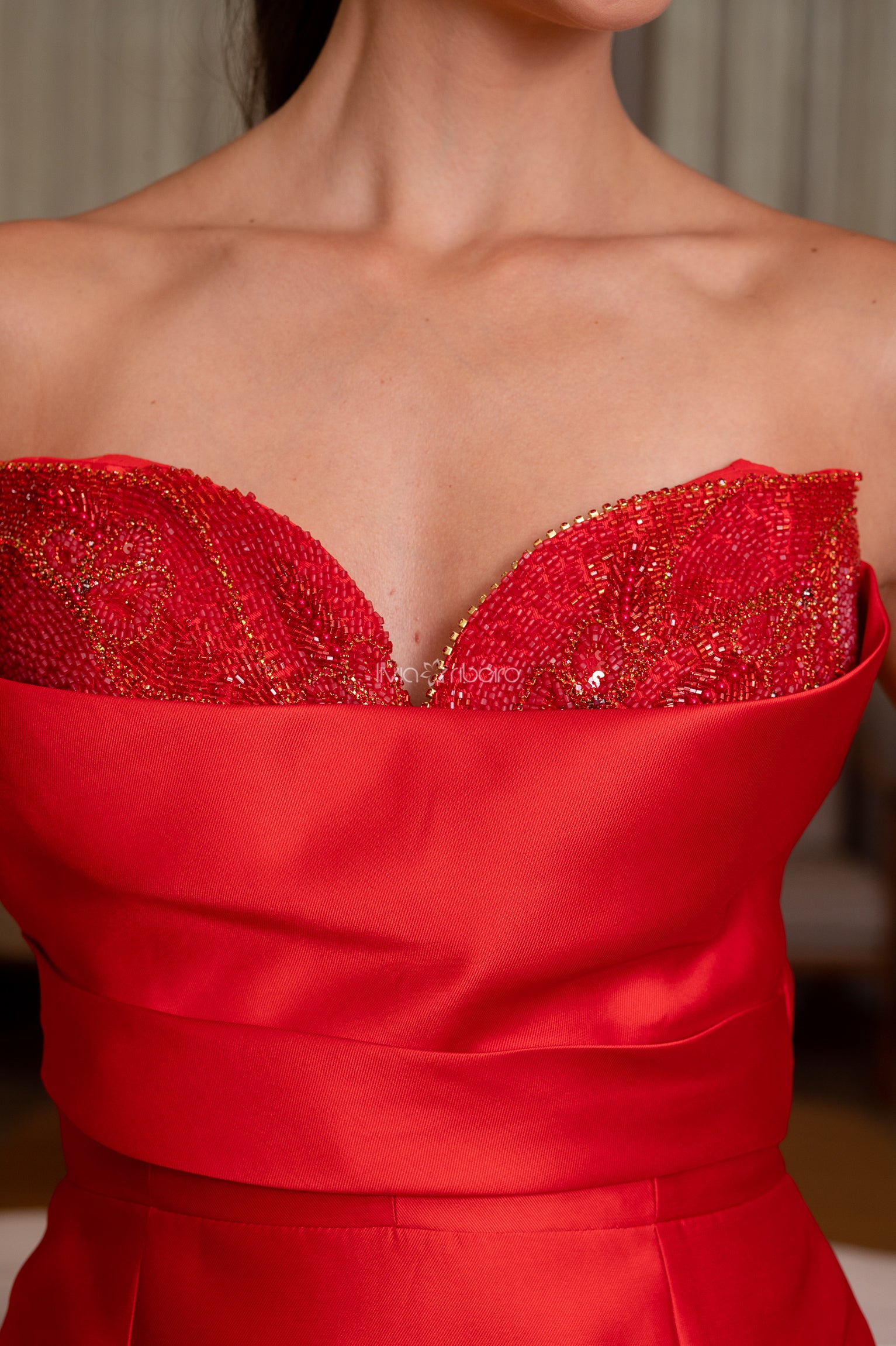 Vestido vermelho tomara que caia sereia em zibeline com detalhe bordado no busto.
