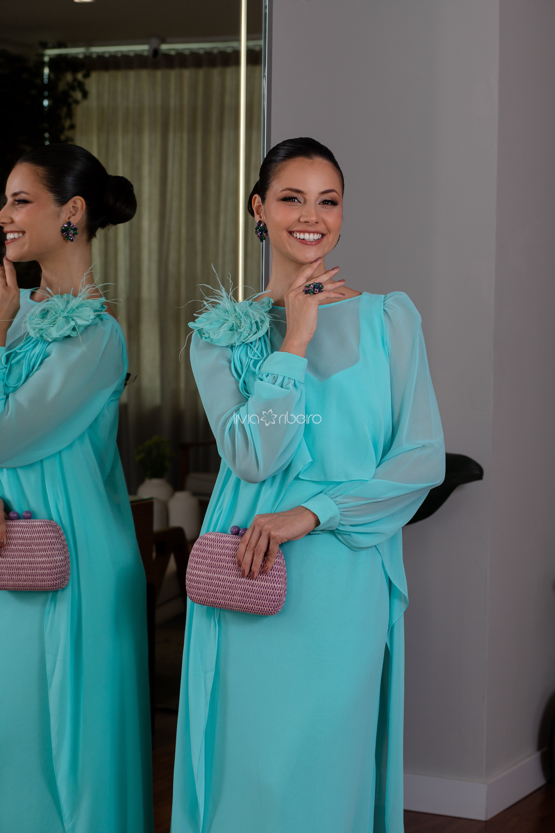 Vestido Lívia Ribeiro em crepe de seda com manga e flor removível