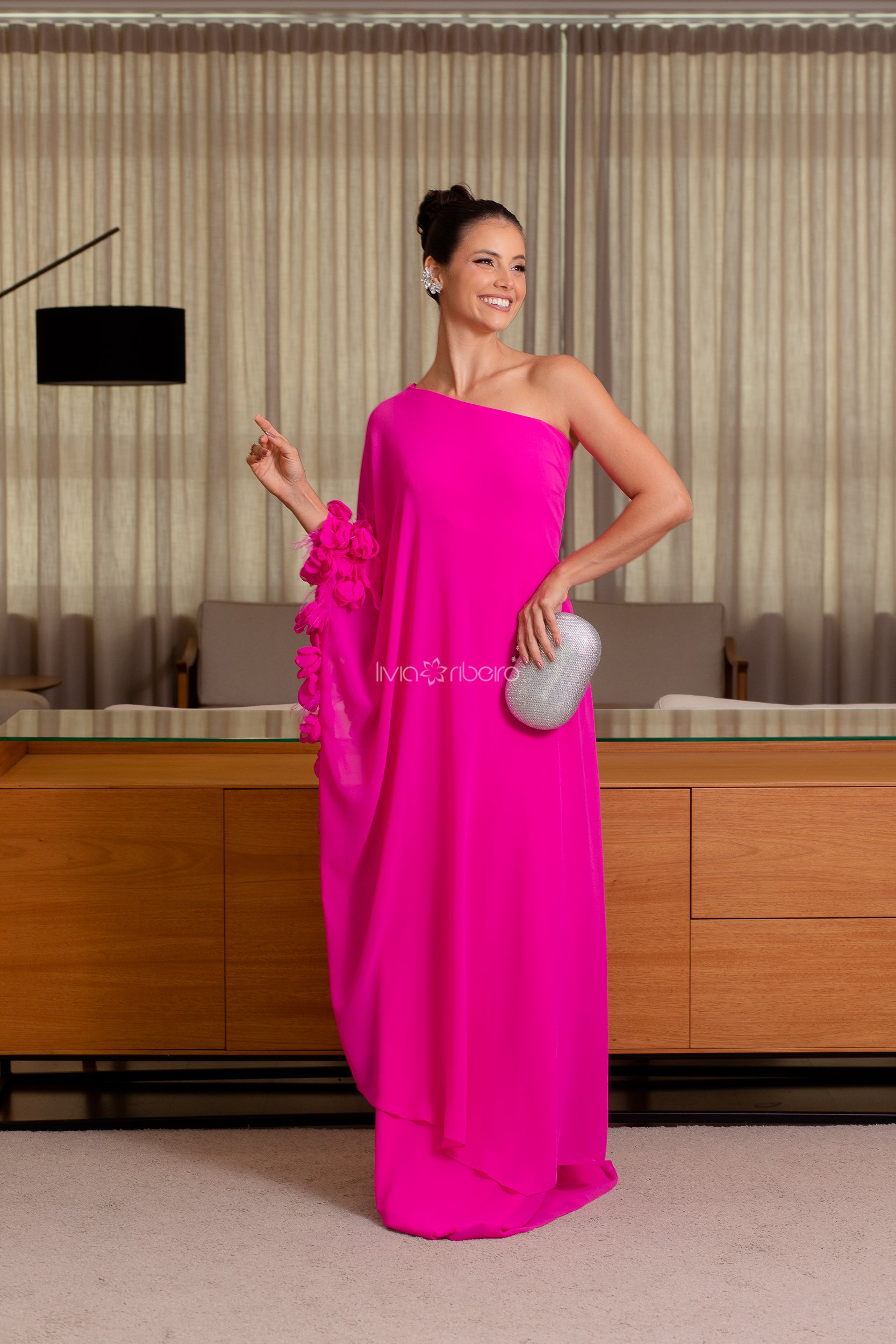 Vestido em crepe de seda de um ombro, com capa e flores aplicadas no ombro.