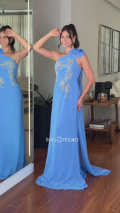 Vestido em crepe com toque de seda, com capa nas costas, flor aplicada no ombro e bordado em pedraria no corpo do vestido.