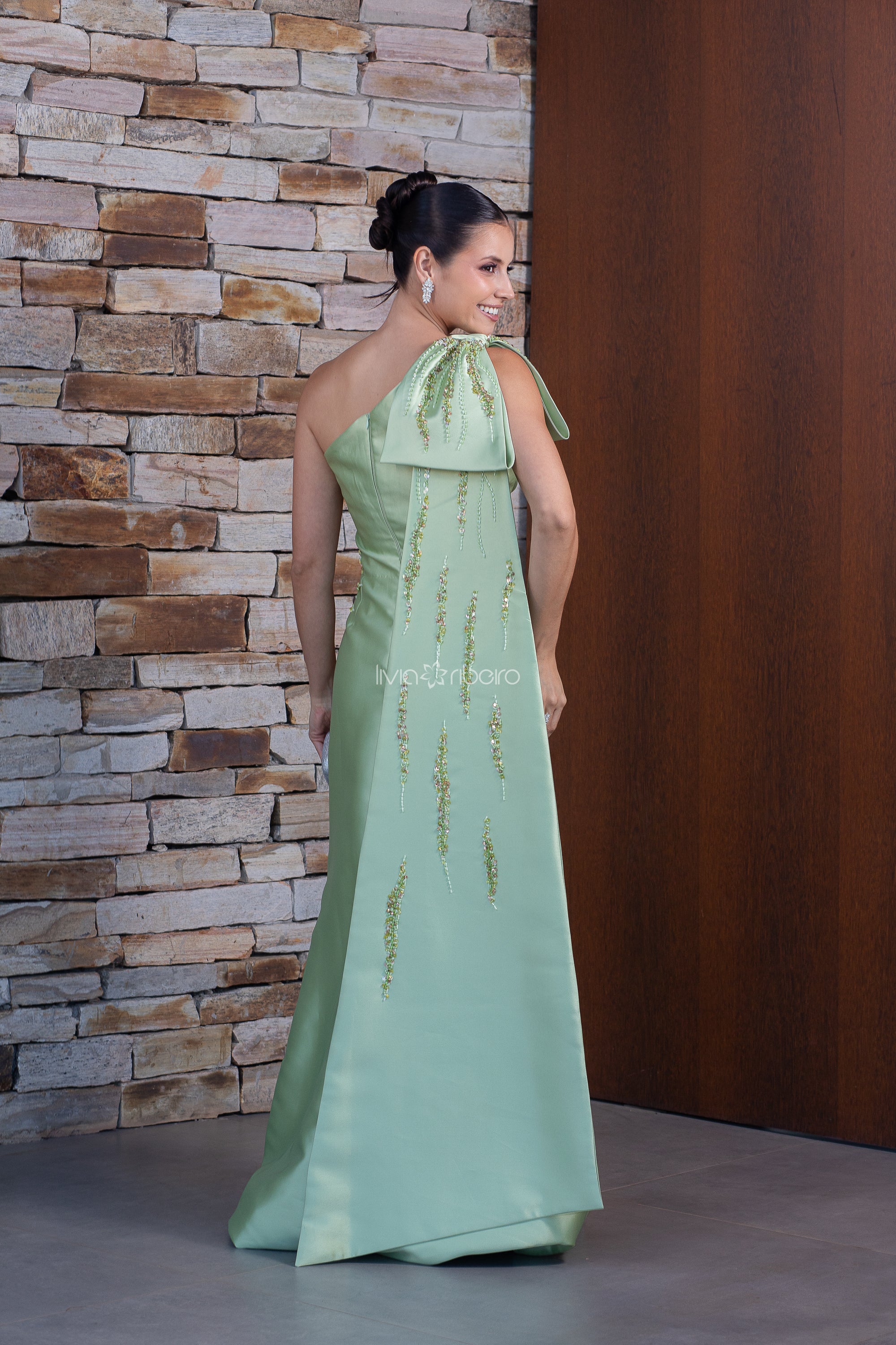 Vestido em alfaiataria um ombro só com detalhe em laço bordado