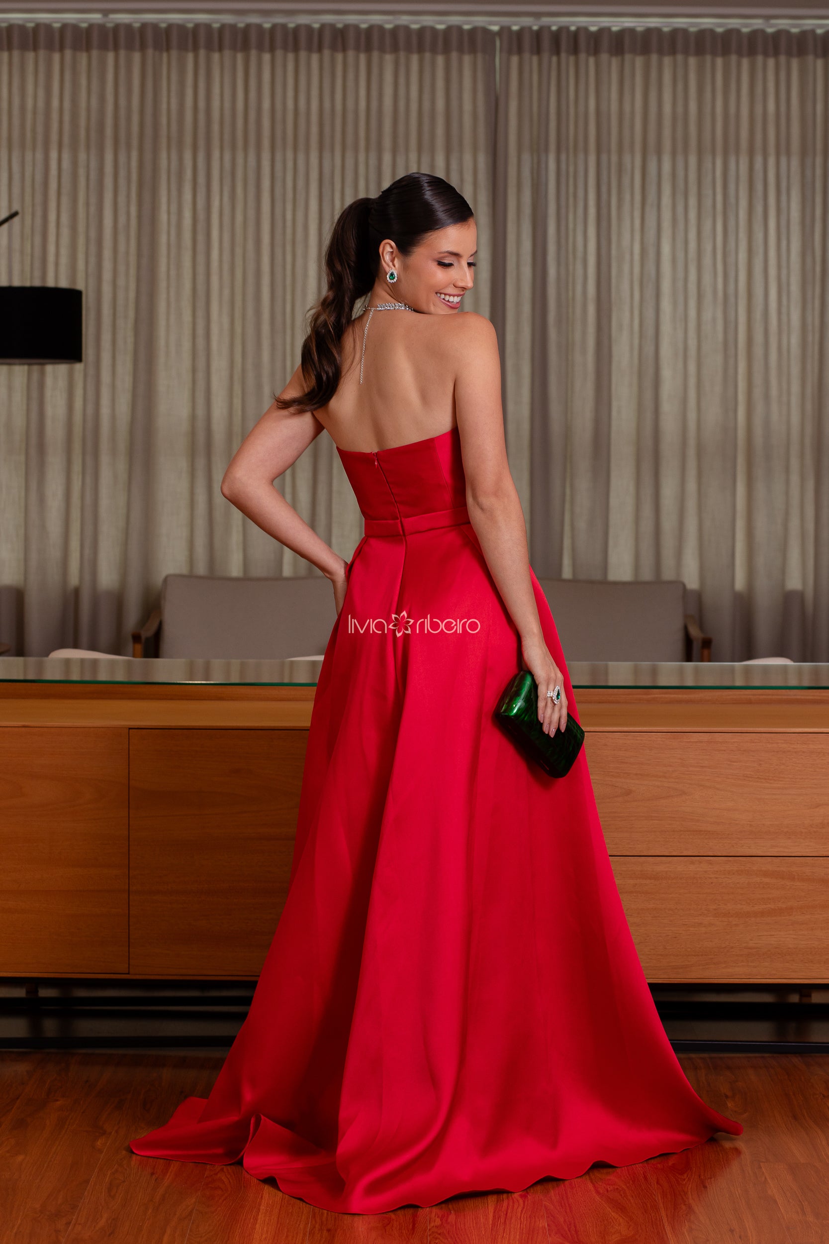 Vestido Lívia Ribeiro tomara que caia decote V e laço na cintura.