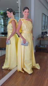 Vestido em zibeline, corte sereia com sobreposição de saia, com laço no ombro e bordado em pedrarias no busto descendo até a saia.