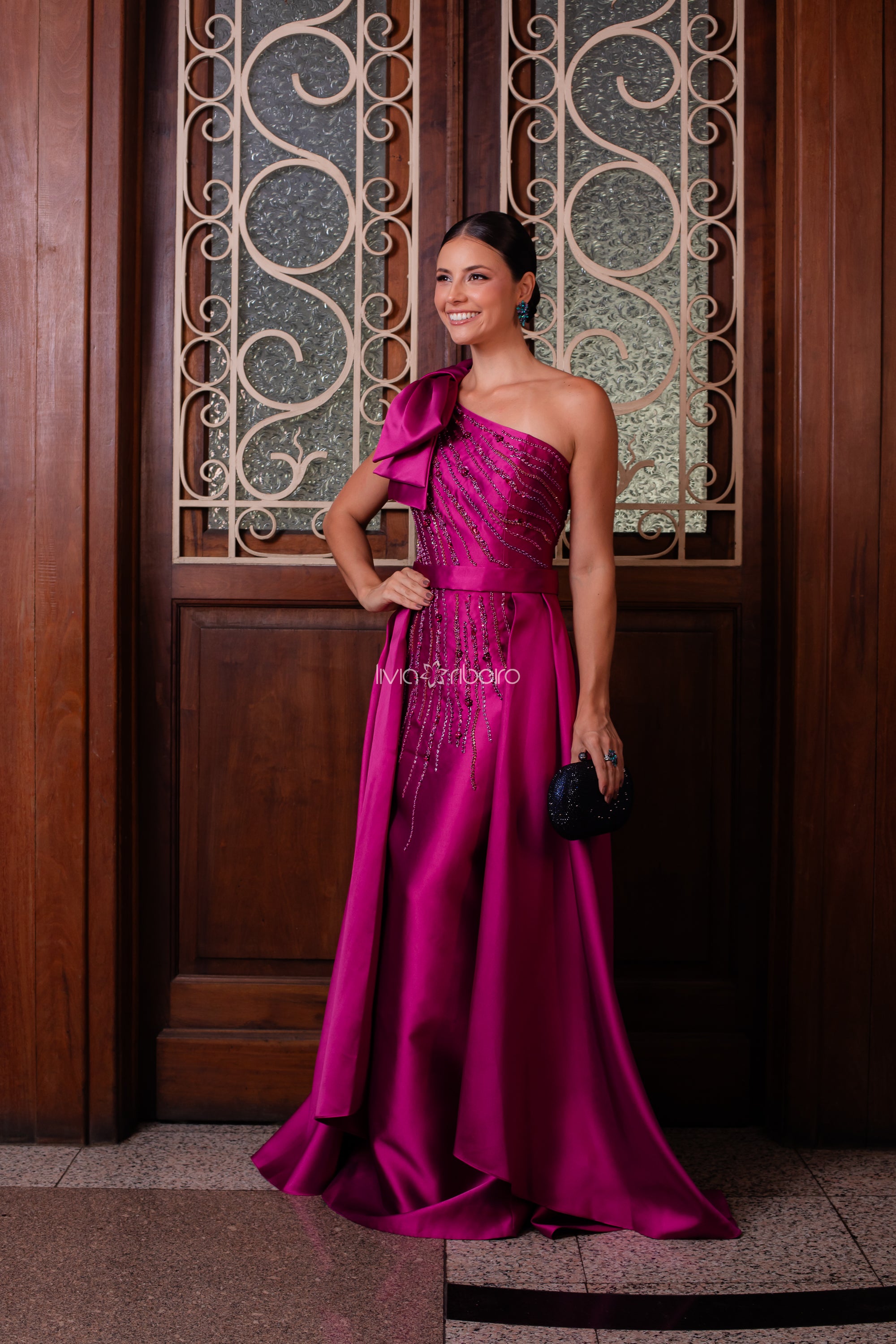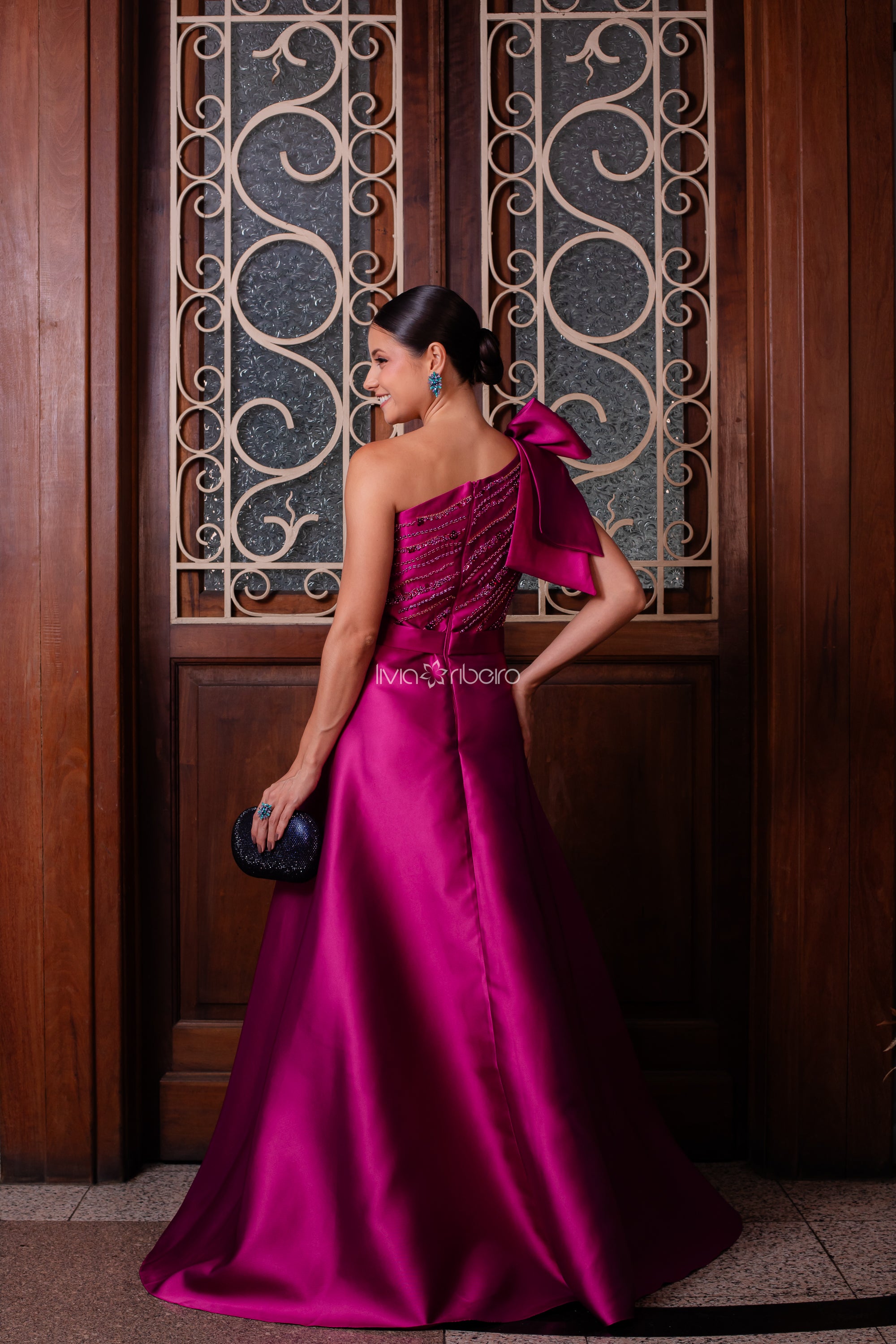 O laço estruturado no ombro valoriza o desenho assimétrico da peça, enquanto o bordado em pedrarias aplicado no busto desce suavemente até a saia, criando um efeito vertical elegante e alongador.