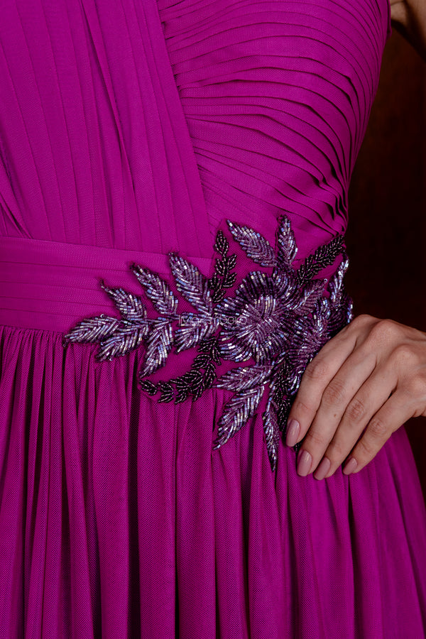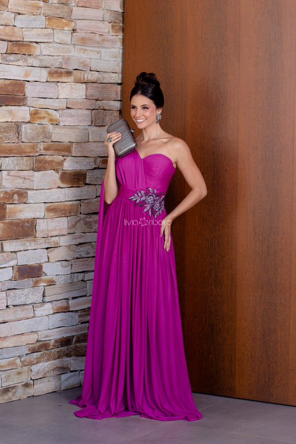 Vestido em tule hidratado, com drapeado no busto e bordado em pedraria na cintura.